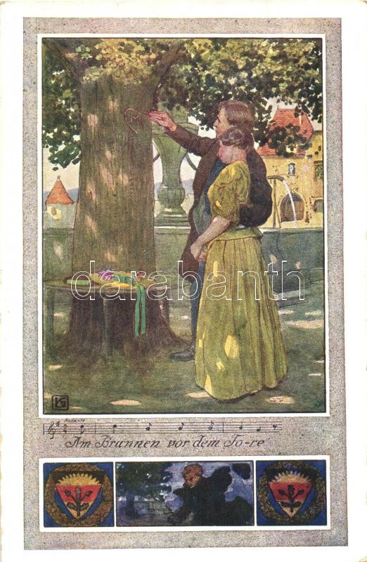 Leírás: German art postcard, couple carving into a tree, music sheet, Deutscher Schulverein Karte, Josef Eberle Nr. 38