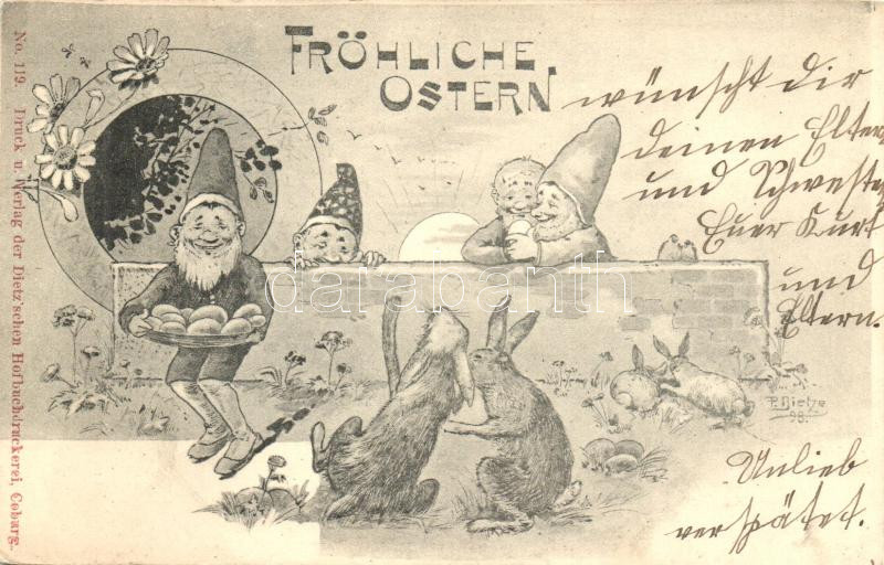 Leírás: Easter, dwarves, rabbits, Dietze's Hobuchdruckerei No. 119. s: P. Dietze
