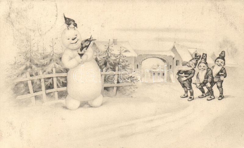 New Year, Dwarves with snowman, humour, P.F.B. Serie 386.a. https://www.darabanth.com/hu/253-Gyorsarveres/253.0/Motivum-kepeslapok/Torpe~28/New-Year-Dwarves-with-snowman-humour-PFB-Serie-386a~II1227297