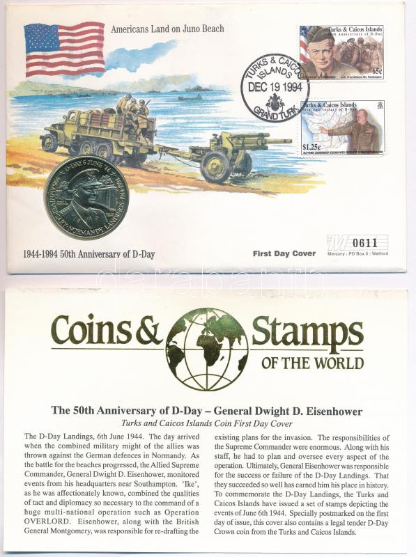 Leírás: Turks- és Caicos-szigetek 1994. 5C "Normandiai partraszállás 50. évfordulója - Eisenhower" érmés, bélyeges borítékon, ismertetővel T:1