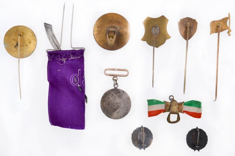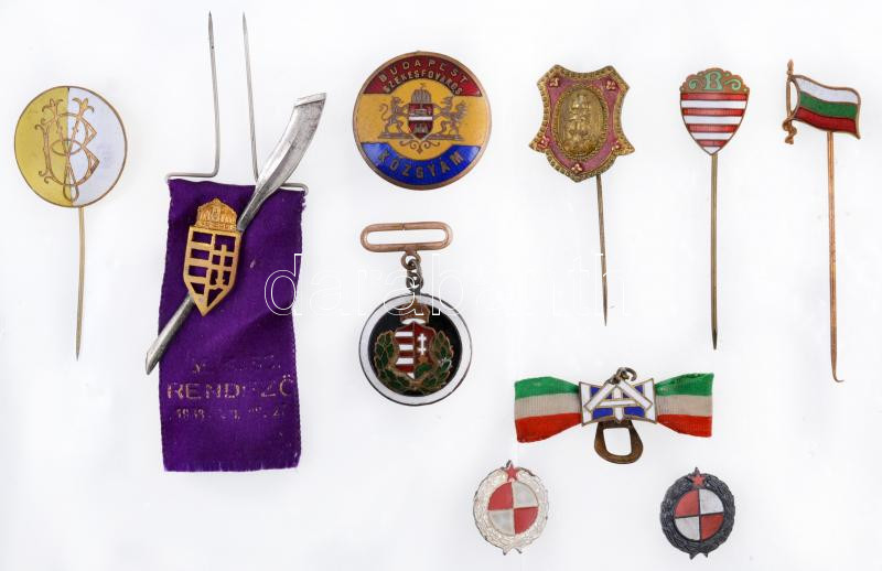 10db-os érdekes vegyes jelvény, kitűző tétel, főleg régi zománcozott darabok, közte bolgár zászlós zománcozott nyakkendőtű (18x16mm), "Budapest Főváros Közgyám" zománcozott jelvény (28,5mm) T:2,2-