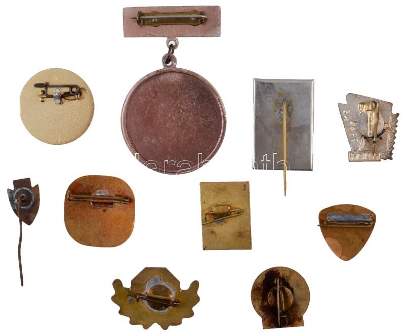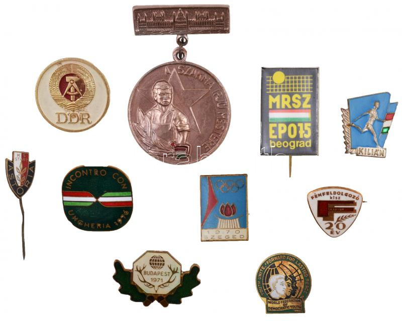 10db-os vegyes magyar és külföldi jelvény és kitűző tétel, közte 1971. "Budapest 1971 (Vadászati Világkiállítás)" zománcozott fém jelvény, DN "A szakma ifjú mestere" fém kitüntetés, "Kilián" zománcozott, sorszámozott fém jelvény T:2