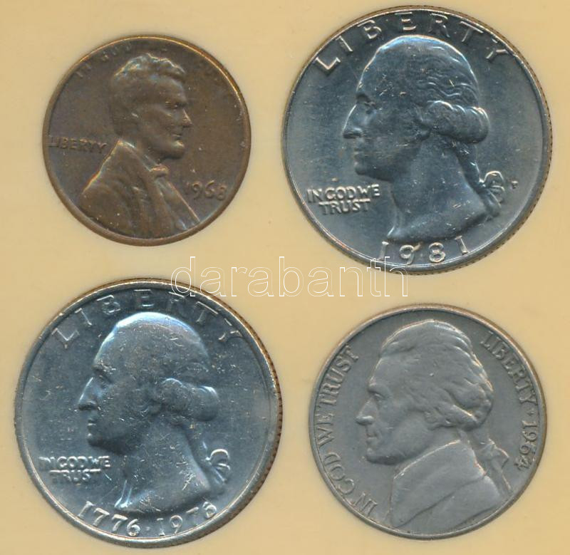 Amerikai Egyesült Államok 1964. 5c + 1968. 1c + 1976. 1/4$ + 1981. 1/4$ plasztiktokban T:2,2-