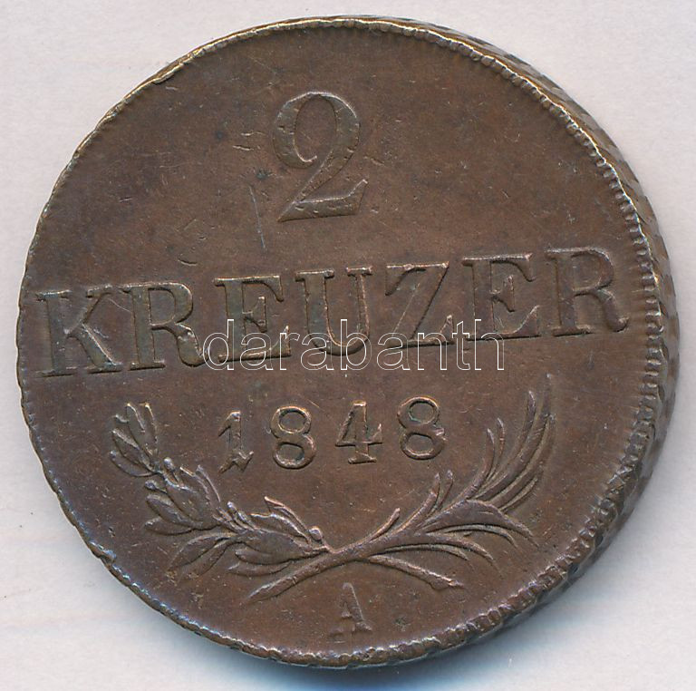 Krause KM#... https://www.darabanth.com/hu/253-Gyorsarveres/253.0/Numizmatika/Kulfoldi-fem-es-ezustpenzek~200012/Ausztria-1848A-2kr-Cu-T2--Austria-1848A-2-Kreuzer-Cu-CXF--Krause-KM232188~II1229812