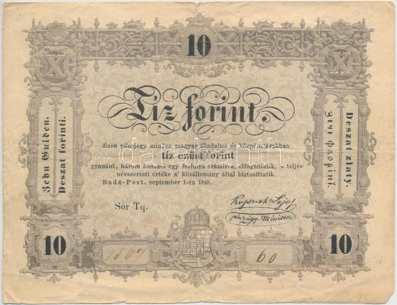 1848. 10Ft "Kossuth bankó" "bünteteTTnek" nyomdai ... https://www.darabanth.com/hu/253-Gyorsarveres/253.0/Numizmatika/Magyar-bankjegyek~200007/1848-10Ft-Kossuth-banko-bunteteTTnek-nyomdai-elirassal-TIII-III---Hungary-1848-10-Forint~II1228686