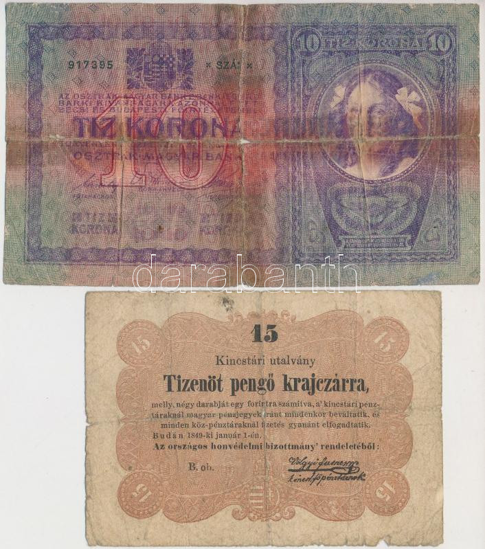 Leírás: 1849. 15kr "Kossuth bankó" + 1904. 10K ragasztva T:III-,V