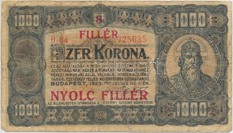 Leírás: 1923. 1000K "8 FILLÉR - NYOLC FILLÉR" felülnyomással T:III-