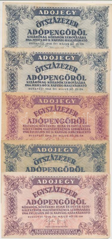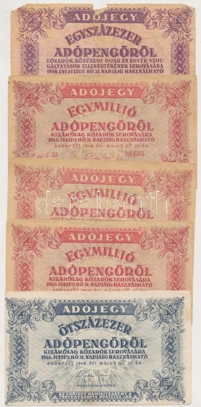 Leírás: 1946. 10db-os vegyes magyar adópengő bankjegy tétel, közte fordított címeres is T:vegyes