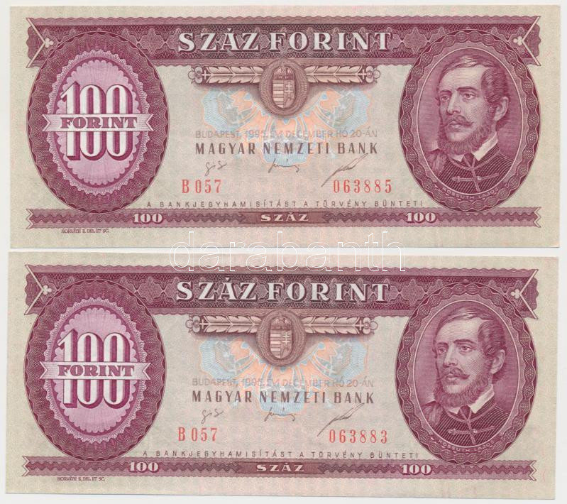 1995. 100Ft (2x) egyugrású sorszámokkal, nyomdai festékfoltokkal T:I-,... https://www.darabanth.com/hu/253-Gyorsarveres/253.0/Numizmatika/Magyar-bankjegyek~200007/1995-100Ft-2x-egyugrasu-sorszamokkal-nyomdai-festekfoltokkal-TI-II~II1223661