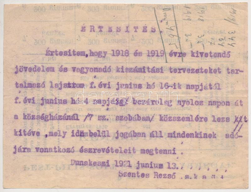 Leírás: 1916. Kenyérjegy "Pest-Pilis-Solt-Kiskun Vármegye" számára, hátoldalán "Értesítés" Dunakeszire vonatkozóan 1921. június 13. dátummal T:III