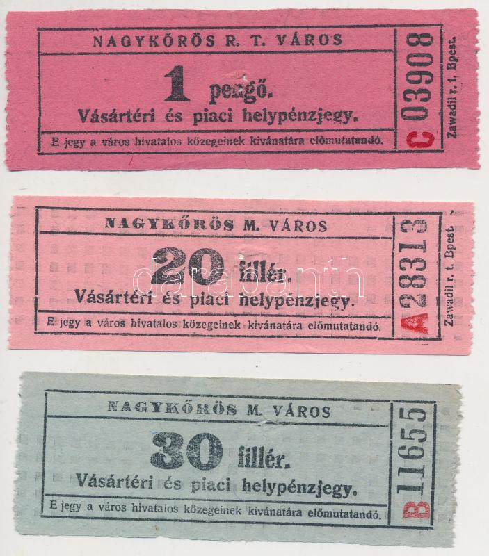 Leírás: ~1930-1940. 20f + 30f + 1P "Nagykőrös M. Város - Vásártéri és piaci helypénzjegy" T:III