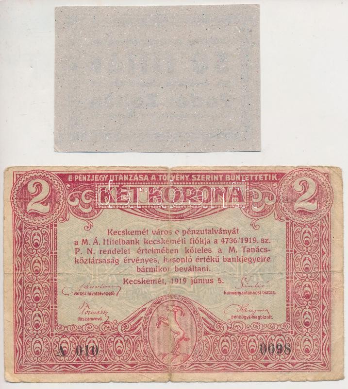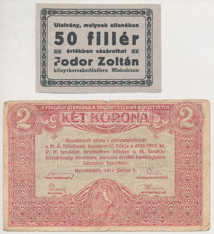 Leírás: Kecskemét 1919.06.05. 2K + Miskolc ~1930. 50f "Fodor Zoltán Könyvkereskedés" utalvány T:II,III,III-