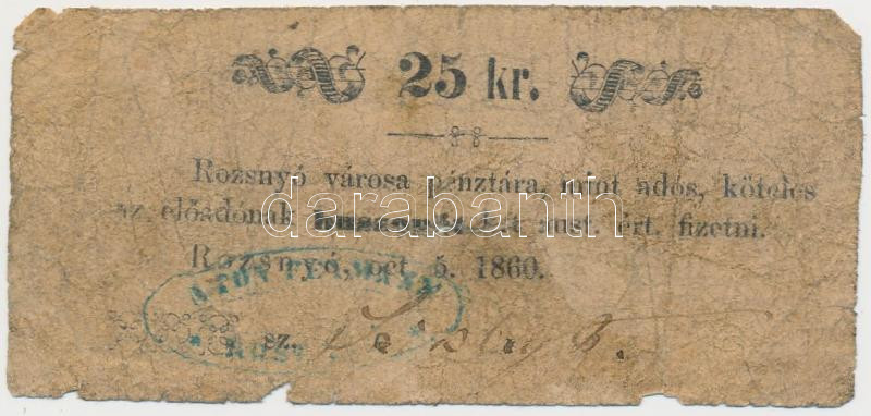 Leírás: Rozsnyó 1860. 25kr "Rozsnyó város pénztára, mint adós" T:IV
