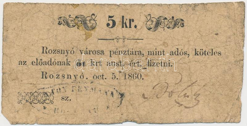 Leírás: Rozsnyó 1860. 5kr "Rozsnyó város pénztára, mint adós" T:III-,IV
