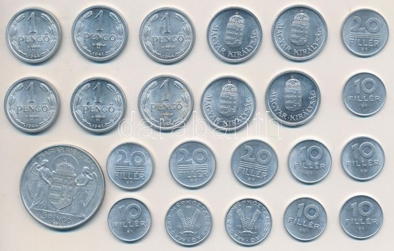 1941-1944. 1P Al (10x) + 1943. 5P Al + 1971-1992. 10f Al (14x) + 1987-... https://www.darabanth.com/hu/253-Gyorsarveres/253.0/Numizmatika/Magyar-fem-es-ezustpenzek~200008/1941-1944-1P-Al-10x-plus-1943-5P-Al-plus-1971-1992-10f-Al-14x-plus-1987-1991-20f-Al-8x-T1-2~II1224378