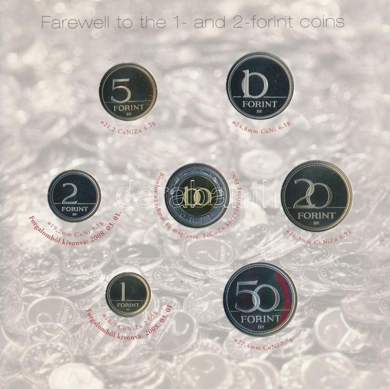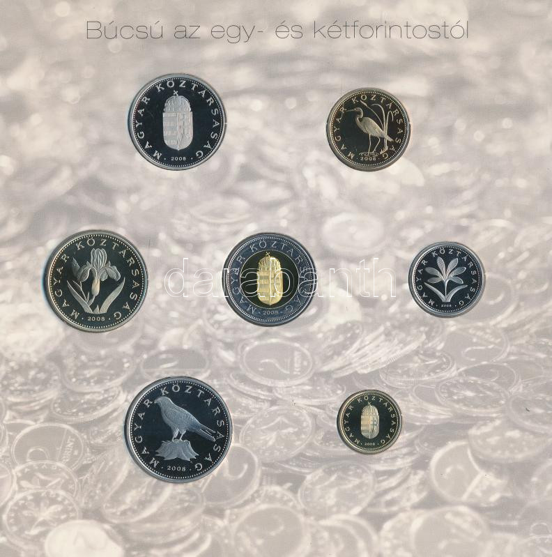 2008. 1Ft-100Ft 7xklf darabos forgalmi sor "Búcsú az egy- és kétf... https://www.darabanth.com/hu/253-Gyorsarveres/253.0/Numizmatika/Magyar-fem-es-ezustpenzek~200008/2008-1Ft-100Ft-7xklf-darabos-forgalmi-sor-Bucsu-az-egy-es-ketforintostol-disztokos-szettbe~II1224461