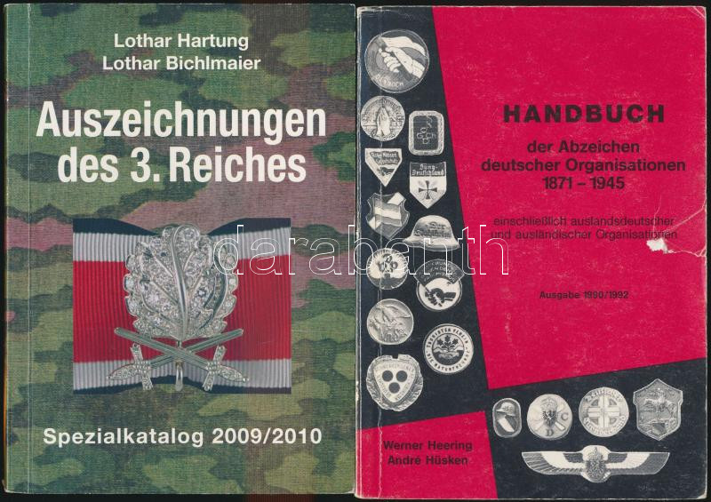 Lothar Hartung - Lothar Bichlmaier: Auszeichnungen des 3. Reiches. Spezialkatalog 2009/2010. 26. Auflage + Werner Heering - André Hüsken: Handbuch der Abzeichen deutscher Organisationen 1871-1945. Ausgabe 1990/1992. használt állapotban
