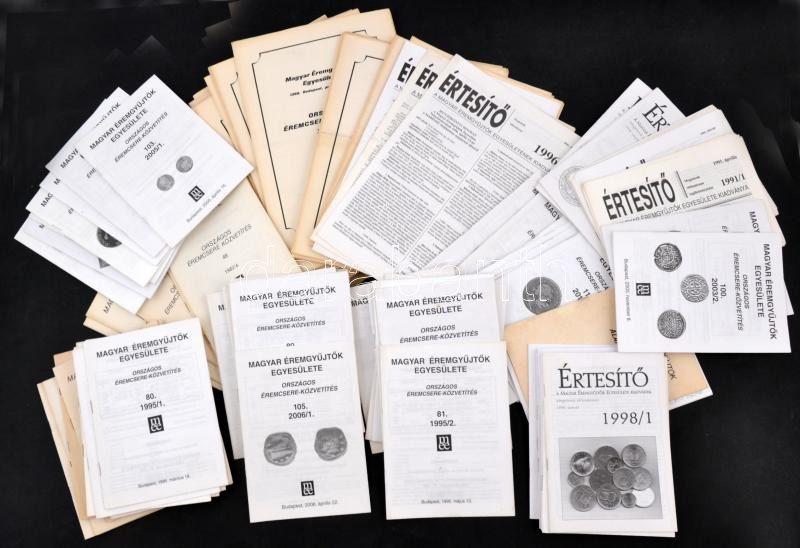 Magyar Éremgyűjtők Egyesülete Országos Éremcsere-közvetítés katalógusai ~1977-2010. (67x) + Alapszabály + Értesítő klf számai ~1991-2001. (14x) használt állapotban