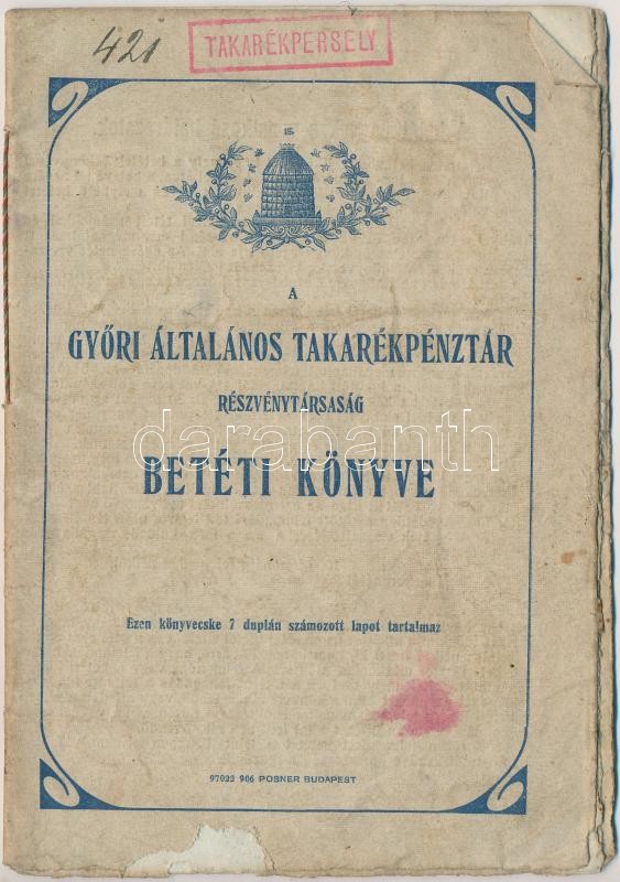 Leírás: ~1908-1940. 3db klf betétkönyv, közte "Magyar Királyi Postatakarékpénztár Budapest" (2xklf), "Győri Általános Takarékpénztár Részvénytársaság"