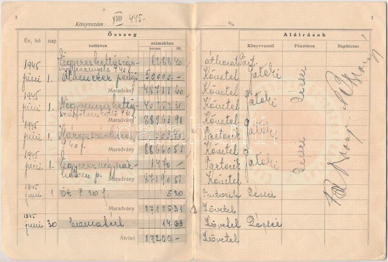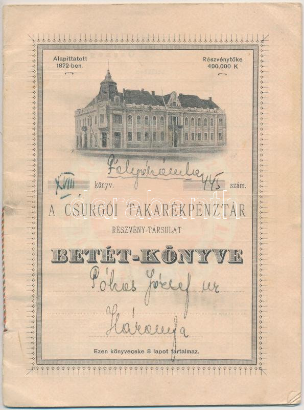 Leírás: Csurgó 1945. "A Csurgói Takarékpénztár Részvény-Társulat Betét-Könyve" kitöltött oldalakkal