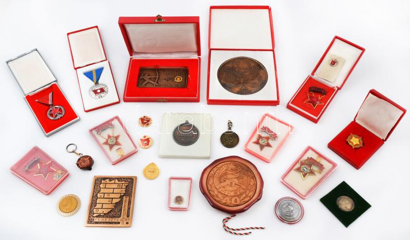 23db vegyes szocialista kitüntetés, emlékérem, dÃjérem, közte "Kiváló Dolgozó" kitüntetések, "MHSZ 40" fém és kerámia plakett (~110mm), "Településfejlesztésért / Bács-Kiskun Megyei Tanács és a Hazafias Népfront Megyei Bizottsága" Br plakett (95x78mm) T:vegyes