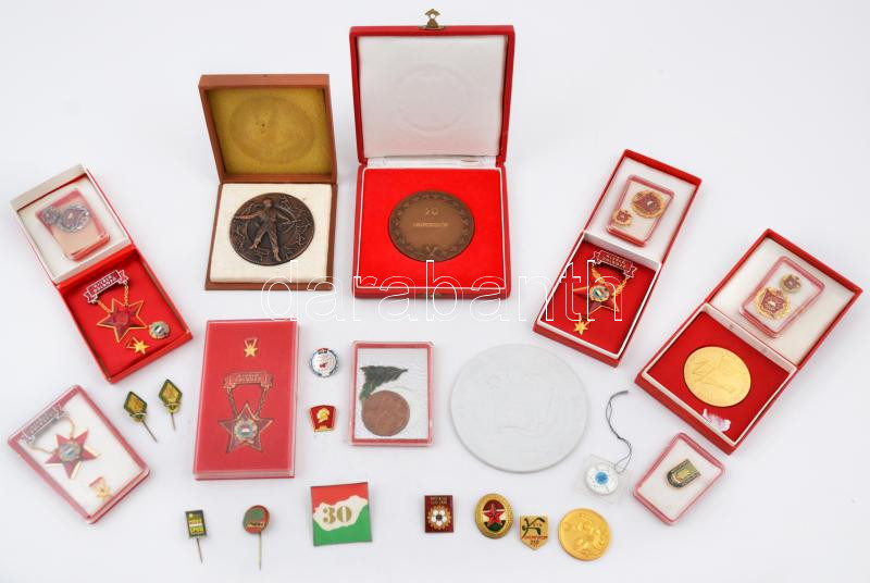 Leírás: 25db vegyes szocialista jelvény, emlékérem, több eredeti tokkal, közte "Kiváló Dolgozó", "Szocialista Brigád" jelvények, "Aranykalász Újkígyós" zománcozott fém jelvény tokban, "BKV Hűségérem" aranyozott fém emlékérem, "Eredményes Propagandista Munkáért KISZ Budapesti Bizottsága" aranyozott fém emlékérem eredeti tokban T:vegyes