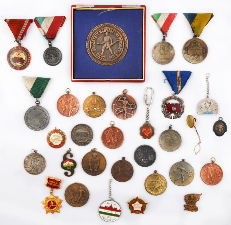 31db vegyes, fÅ‘leg szocialista dÃjérem, kitüntetés, emlékérem, közte "E.T.E. TúratávevezÅ‘s Verseny 1940. II. DÃj Kormányos" Br dÃjérem "ARKANZAS BP." gyártói jelzéssel, ~1970-1980. "Összetett Honvédelmi Verseny Országos DöntÅ‘" Br lemezérem (64mm) T:vegyes