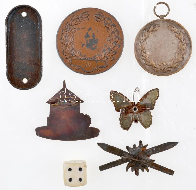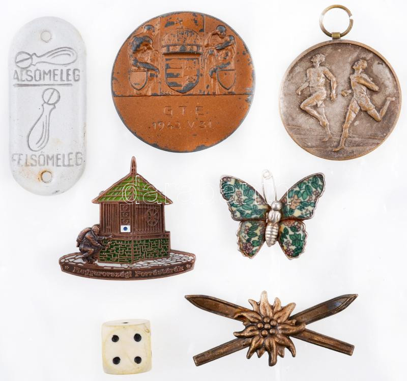 Leírás: 7db-os vegyes jelvény, érem és egyéb tétel, közte Sződy Szilárd (1878-1939) 1942. "G.T.E. 1942. V. 31." bronzozott fém díjérem (45mm) ,DN "Magyarországi Forrástúrák" fém jelvény T:vegyes