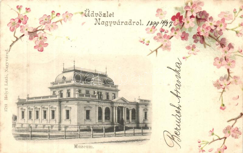 1899 Nagyvárad, Oradea; múzeum, kiadja Helyfi László / museum, floral,... https://www.darabanth.com/hu/253-Gyorsarveres/253.0/Varoskepes-lapok-es-kepeslap-tetelek/Erdely~6/1899-Nagyvarad-Oradea-muzeum-kiadja-Helyfi-Laszlo-museum-floral-litho-lyuk-pinhole~II1228111