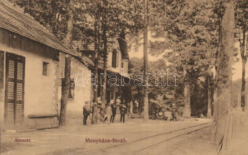 Leírás: Menyháza-fürdő, Állomás; Fái Károly kiadása / railway station (ázott sarok / wet corner)