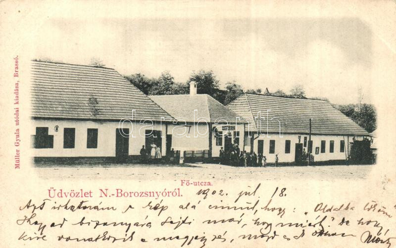 Leírás: Nagyborosnyó, Nagyborozsnyó, Borosneu Mare; Fő utca, fodrász, kiadja Müller Gyula utóda / main street, hairdresser