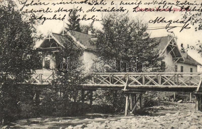 Leírás: Szováta-fürdő, Fahíd, Gyógyszertár; kiadja Erdélyi Simon / bridge, pharmacy (EB)