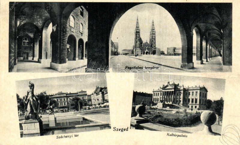 Szeged, Fogadalmi templom, Széchenyi tér, Kultúrpalota (b) https://www.darabanth.com/hu/253-Gyorsarveres/253.0/Varoskepes-lapok-es-kepeslap-tetelek/Magyarorszag~5/Szeged-Fogadalmi-templom-Szechenyi-ter-Kulturpalota-b~II1230934