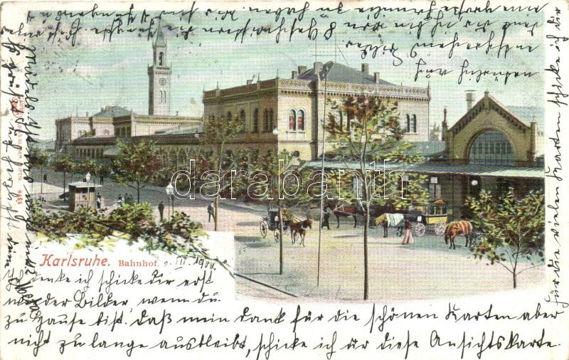 Karlsruhe, Bahnhof / railway station (wet damage) https://www.darabanth.com/hu/253-Gyorsarveres/253.0/Varoskepes-lapok-es-kepeslap-tetelek/Nemetorszag~62/Karlsruhe-Bahnhof-railway-station-wet-damage~II1224686