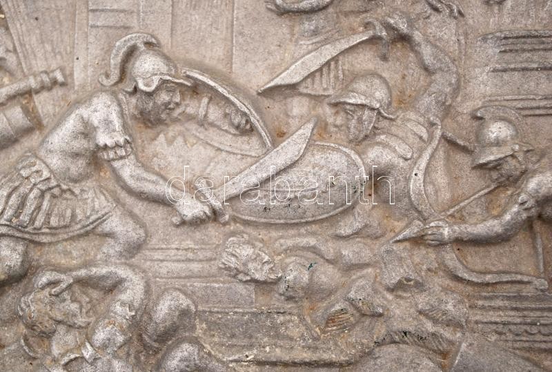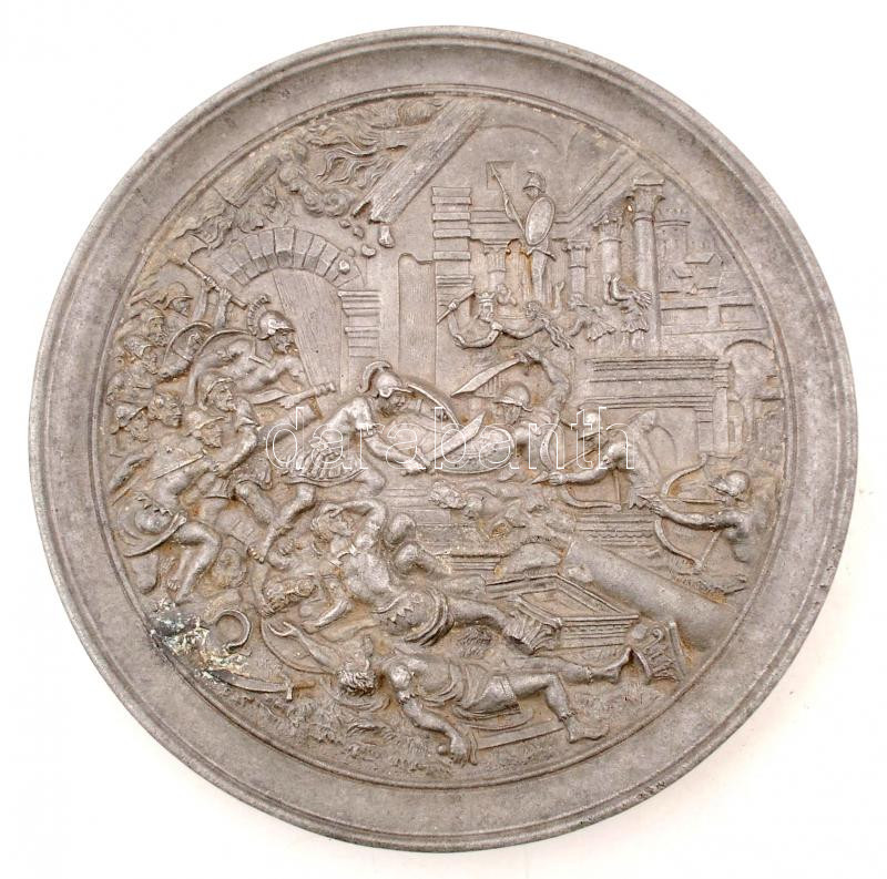 Leírás: Jelzett ón tányér, Trója ostroma relieffel, d:26,5 cm