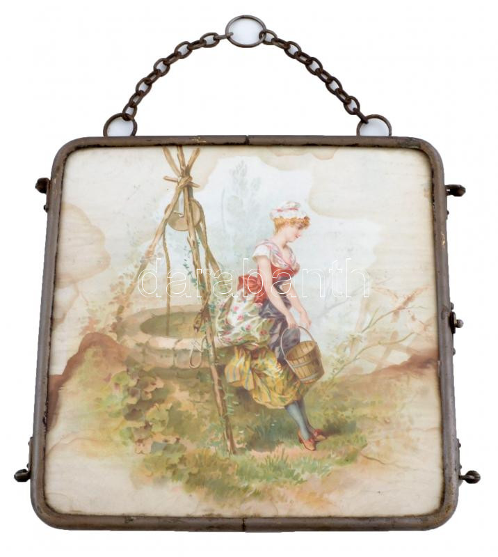 Régi kihajtható három paneles tükör, kettő hátulján életképes jelenettel, az egyik üvege sérült, kopásnyomokkal, egyébként jó állapotban, 20×20 cm (3×)