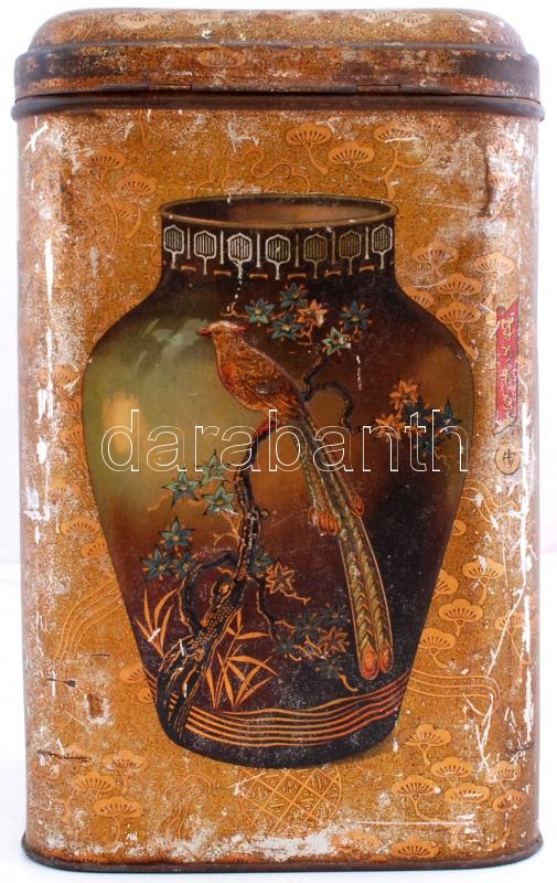 Leírás: Régi nagy méretű fém teás doboz, horpadásokkal, m:35 cm, 20×20 cm