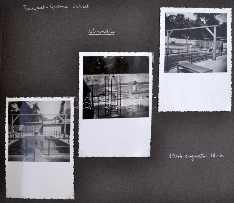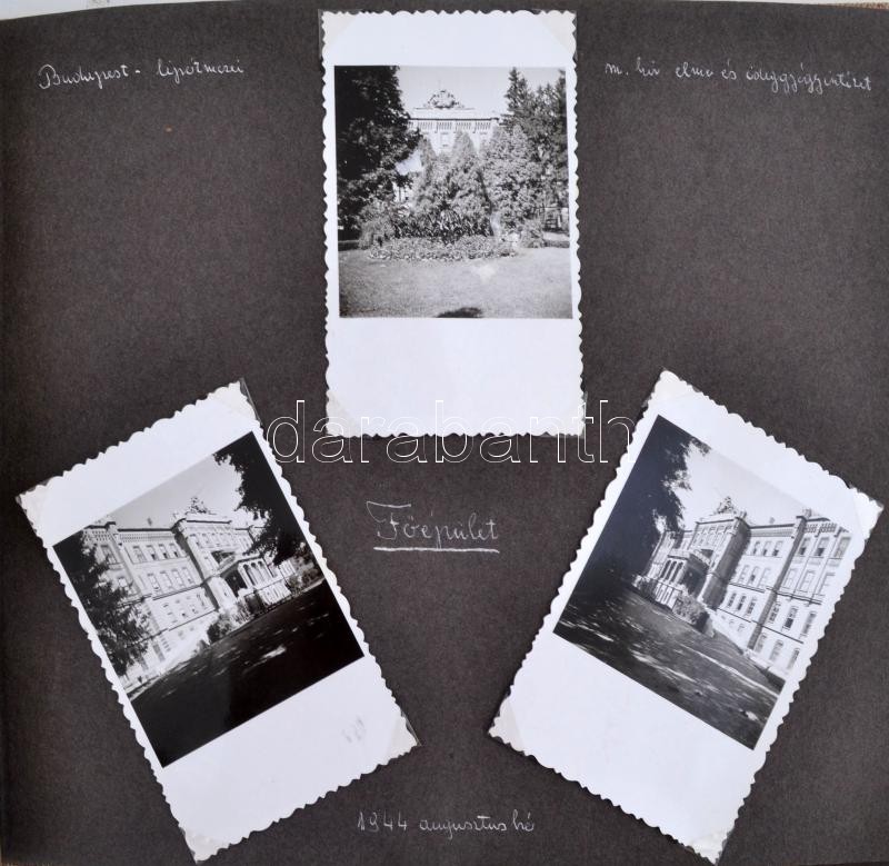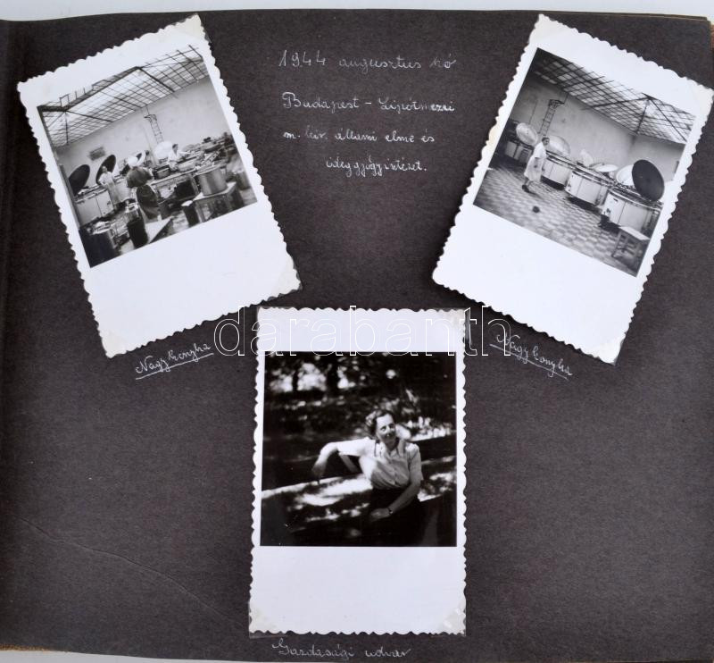1944 Fotóalbum a lipótmezei elmegyógyintézetben dolgozó hölgy 56 felvétele fotóalbumba gyűjtve, kb. a fele munkahelyén készült, 5x5 cm-es képek 6x9-es fotópapíron