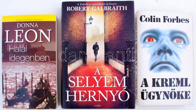 3 db krimi: Forbes, Colin: A Kreml ügynöke. Bp., 1990, Victoria. Papírkötésben, jó állapotban.; Donna Leon: Halál idegenben. Bp., 2008, Geopen Könyvkiadó. Papírkötésben, jó állapotban.; Galbraith, Robert: A selyemhernyó. Bp., 2015, Gabo. Kartonált papírkötésben, papír védőborítóval, jó állapotban.