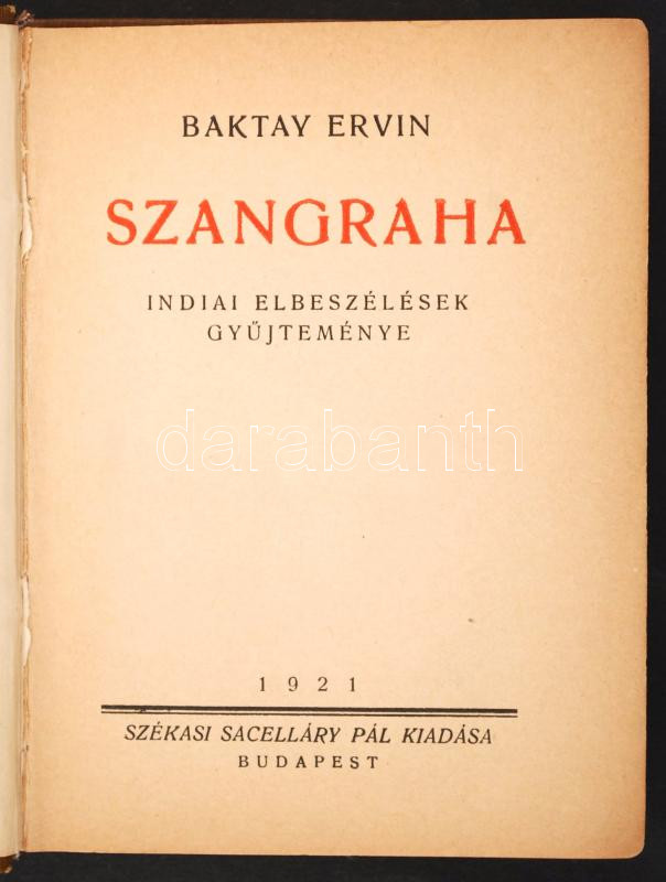 Baktay Ervin: Szanghara. Indiai elbeszélések gyűjteménye. Bp., 1921, Székasy Sacelláry Pál kiadása. Korabeli egészvászon-kötésben, előzéklapok hiányoznak. Ritka kötet, mindössze 2000 példányban készült.