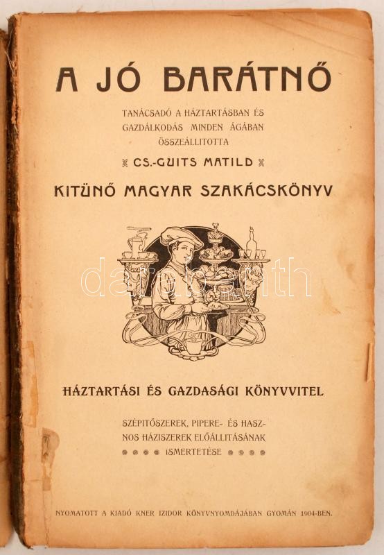 Cs.-Guits Matild: A jó barátnő. Tanácsadó a háztartásban és gazdálkodás minden ágában. Gyoma, 1904, Kner Izidor Könyvnyomdája. Kiadói festett egészvászon kötés, gerincnél sérült, több lap sarka hiányos, szakadt, megviselt állapotban.