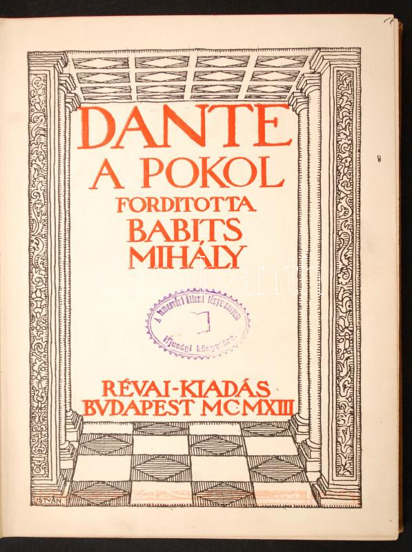 Dante Komédiája I. kötet: A pokol. Fordította Babits Mihály. Bp., 1913, Révai. A fordító dedikációjának kézírás-facsimiléjével. Első magyar nyelvű kiadás. Kiadói aranyozott egészvászon-kötésben.