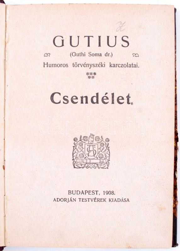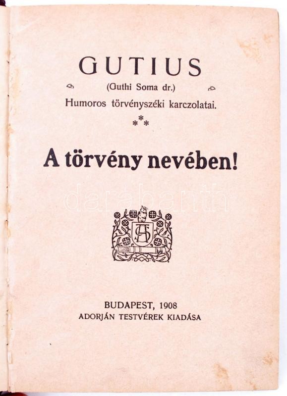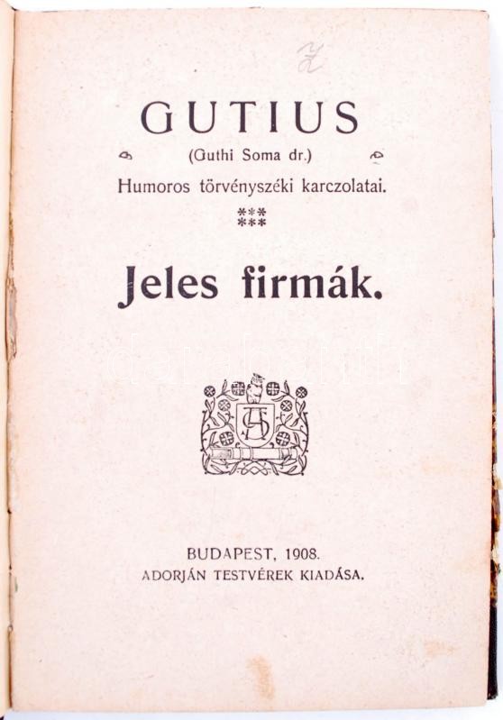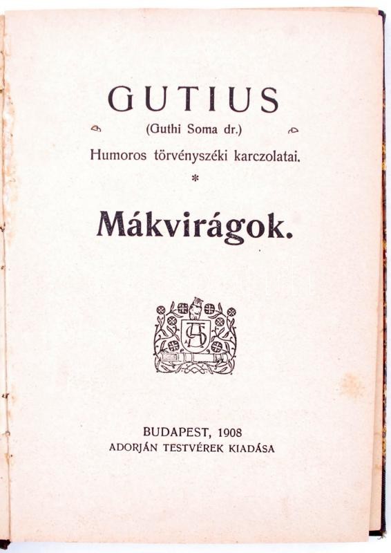 Guthius. Dr. Guthi Soma humoros törvényszéki karcolatai. 5 kötet. Mákvirágok. Budapesti tipusok. Csendélet. Jeles firmák. A törvény nevében! Bp., 1908, Adorján testvérek könyvnyomdája. Korabeli, kissé kopottas félvászonkötésben.