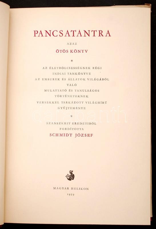 Leírás: Pancsatantra azaz ötöskönyv. Fordította Schmidt József. Bp., 1959, Magyar Helikon. Kiadói félvászonkötésben, kissé sérült borítóval.