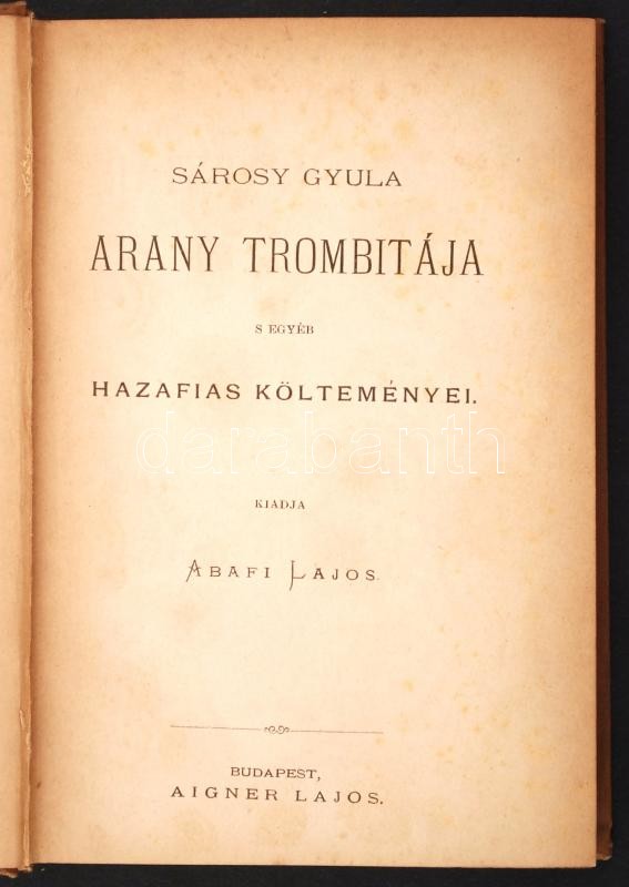 Sárosy Gyula arany trombitája és egyéb hazafias költeményei I. Bp., é.... https://www.darabanth.com/hu/254-Gyorsarveres/254.0/Festmeny-mutargy-papirregiseg-egyeb/Konyvek-Egyeb-ritkasagok~400037/Sarosy-Gyula-arany-trombitaja-es-egyeb-hazafias-koltemenyei-I-Bp-en-Aigner-Lajos-KiadC3~II1231664