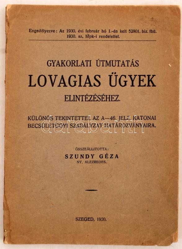 Szundy Géza: Gyakorlati útmutatás lovagias ügyek elintézéséhez. Különös tekintettel az A-46. jelz.katonai becsületügyi szabályzat határozványaira. Szeged, 1930, Szeged Városi Nyomda és Könyvkiadó részvénytársaság. Kiadói papírkötés, kissé kopott állapotban.