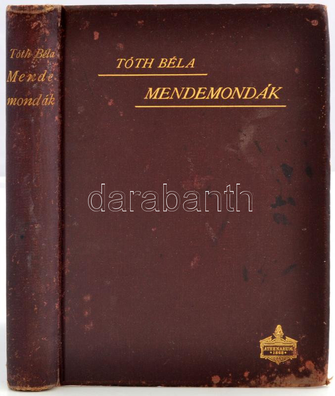 Leírás: Tóth Béla: Mendemondák. Bp., é. n., Athenaeum. Kopott vászonkötésben, címlapja hiányzik, egyébként jó állapotban.