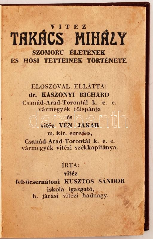 felsőcsernátoni vitéz Kusztos Sándor: Vitéz Takács Mihály szomorú életének és hősi tetteinek története. Előszó: Kászonyi Richárd és vitéz Vén Jakab. Bp., 1938, Fráter ny. Későbbi műbőrkötésben. Ritka kötet.