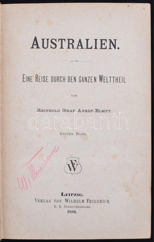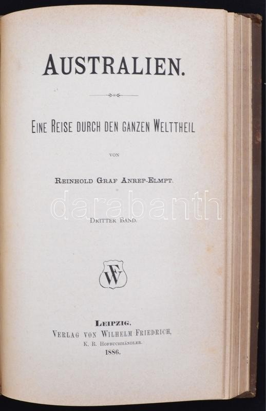 Anrep-Elmpt, Reinhold: Australien. Eine Reise durch die ganzen Welttheil. 1-3. köt. Lipcse, 1886, Verlag von Wilhelm Friedrich. Kissé kopott vászonkötésben, a 2-3. kötet egybekötve, egyébként jó állapotban.