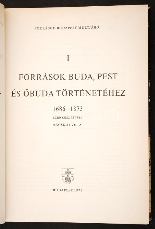 Források Budapest múltjából I. Források Buda, Pest és Óbuda történetéhez 1686-1873. Szerkeszti Bácskai Vera. Bp., 1971, Fővárosi Levéltár. Kiadói aranyozott műbőrkötésben.